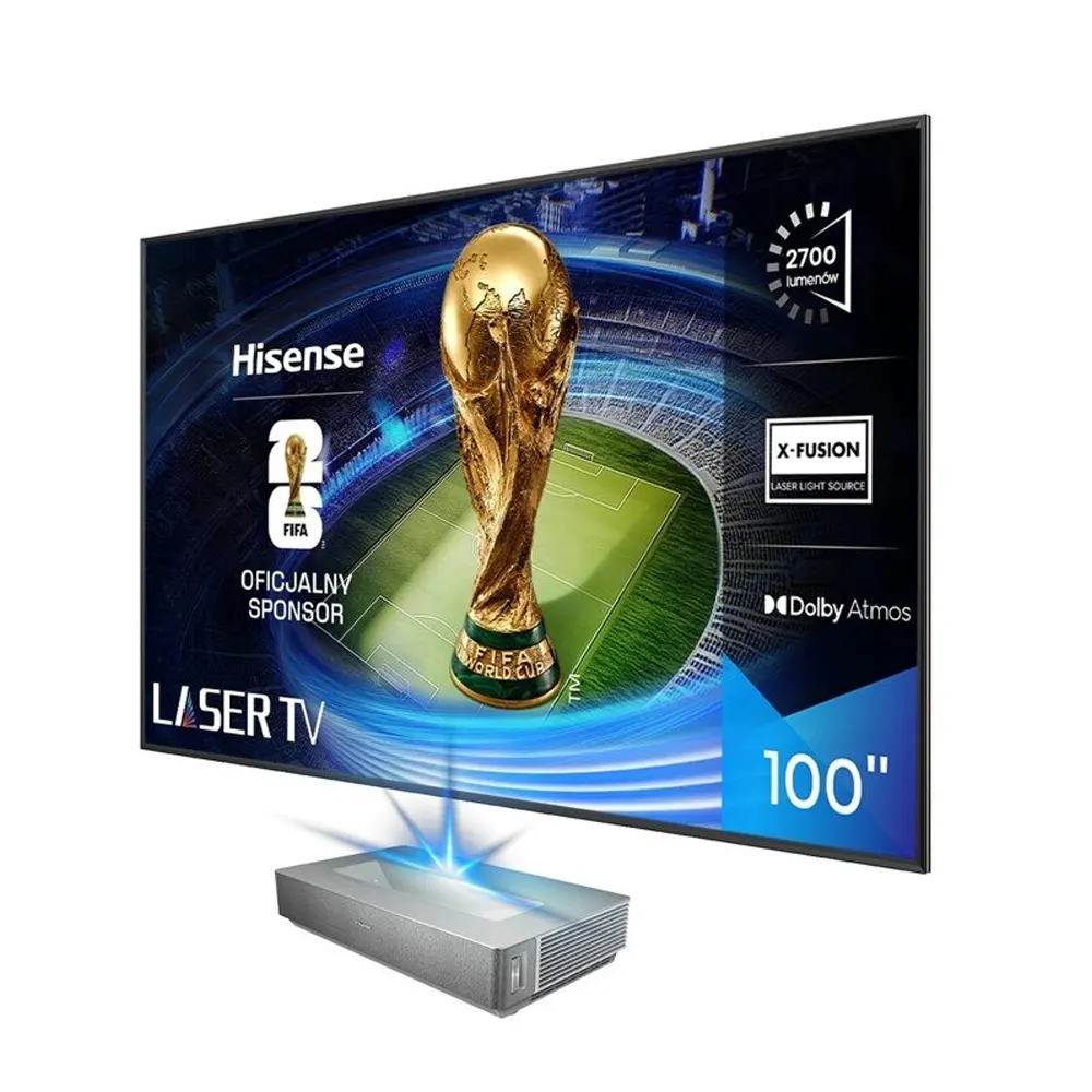 Hisense 100L5ND to nowoczesny Smart Laser TV 4K Ultra Short Throw, zaprojektowany jako wygodna alternatywa dla bardzo dużego telewizora. Dzięki obrazowi o przekątnej 100 cali oraz technologii ultra krótkiego rzutu projektor może być ustawiony tuż przy ścianie, bez konieczności montażu sufitowego czy prowadzenia kabli przez całe pomieszczenie. To rozwiązanie idealne do salonów, w których liczy się estetyka, prostota instalacji i kinowa skala obrazu.