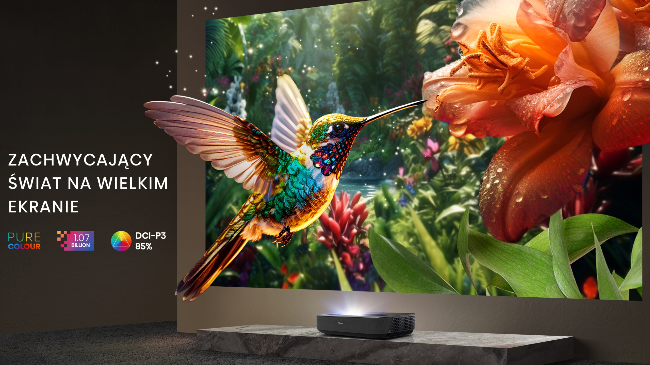 - Obraz 80–150 ″ 4K z ultra‑krótkiego rzutu 0,22 : 1